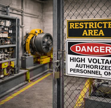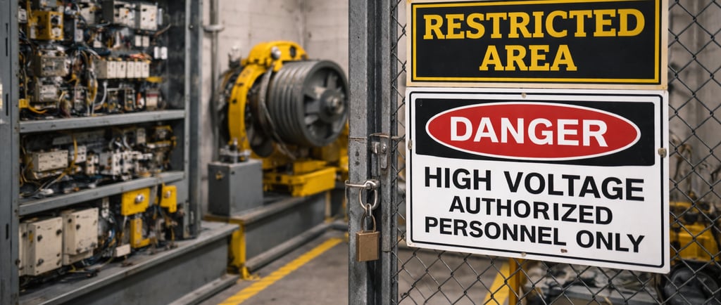 Elevator machine rooms contain energized electrical equipment operating at high voltage. Even brief contact with exposed components can result in severe injury. In addition to electrical hazards, the equipment itself is expensive, precise, and sensitive to its environment.